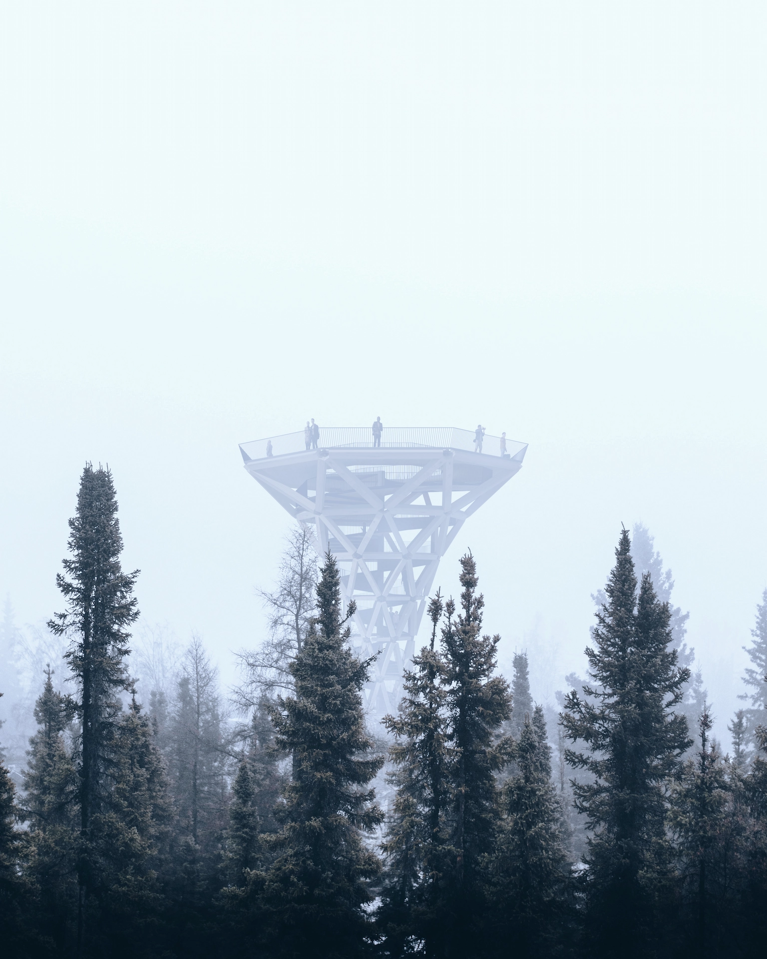 Beside it, the 25-meter observation tower offers a contemplative ascent through the canopy. Inspired by the form of a flower calyx, the tower’s diagrid glulam frame tapers upward to a viewing platform above the treetops. Together, the two elements create a dialogue between shelter and openness—between dining grounded in nature and a quiet moment elevated above it.