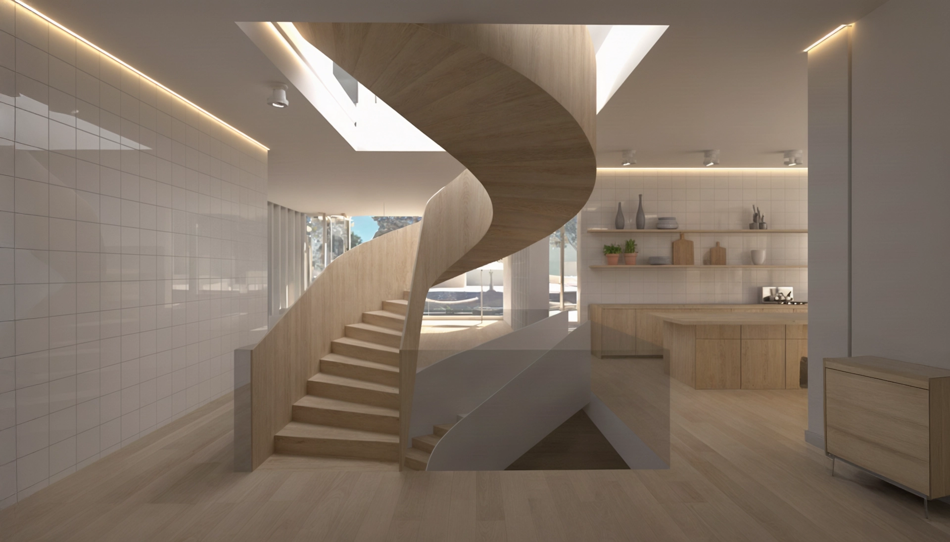The materials chosen for the building support sustainability and create a timeless aesthetic—white stone for a clean, grounded presence, while the natural wood elements create warmth and texture.